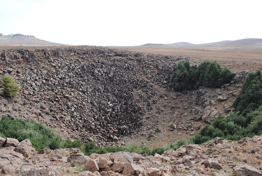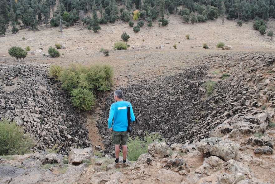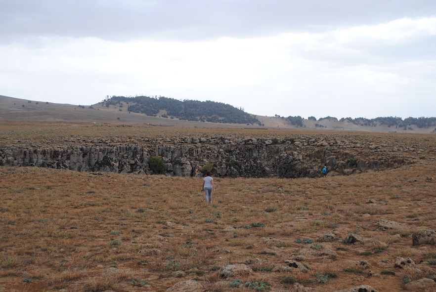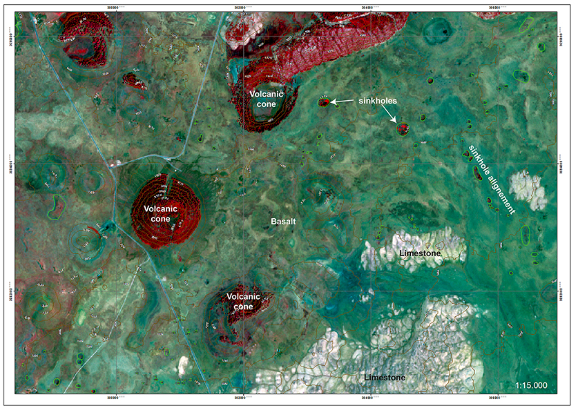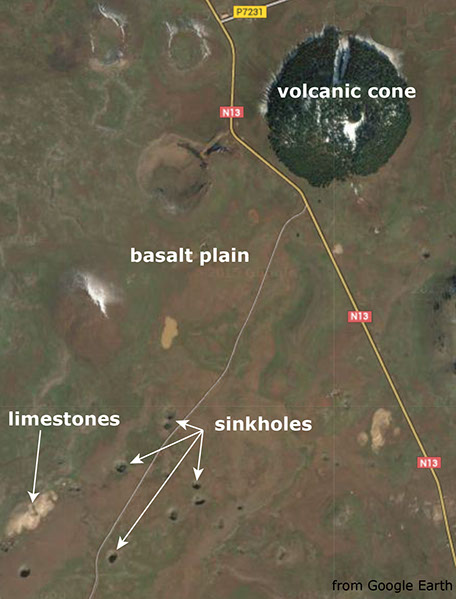 The Azrou plateau is composed of a basaltic plain, dotted with volcanic cones and lava flows, covering Jurassic limestones. Satellite investigation (Landsat and Sentinel-2), together with Google Earth images, have allowed the mapping of over 300 basalt collapses basalts ranging in diameter from a few tens to over 200 and up to 65 metres deep. These sinkholes are sometimes aligned and resemble lava tube collapses as those known from Mars and the Moon. We surveyed almost 150 of these depressions measuring minor and major diameters and depth, and making geomorphological observations. Most collapses are entirely hosted in basalts, with only two of the field-surveyed sinkholes showing some limestone at their bottom. Their genesis is mostly due to collapse by failure of the basaltic roof over an underground void. These voids are related to the underground removal of material through unknown karst conduits and not to collapse of a lava tunnel roof. This is confirmed by the position of most of the sinkholes, as they are close to the boundary with adjacent limestones. The exploration of four small caves entirely hosted in the basalt has confirmed the presence of semicircular voids formed between thicker and more solid lava beds. Underground removal of weathering products of these volcanic rocks through the underlying karst aquifer allows for a stepwise sagging and collapse and the formation, over time, of these sinkholes.